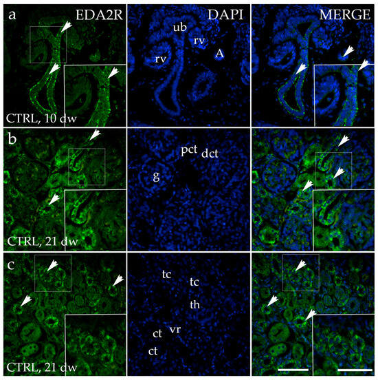 Immunofluorescence staining of the renal cortex (a,b) and medulla (c) of normal human fetal kidney at the 10th and 21st developmental week (dw) (CTRL) with the antibody for ectodysplasin A2 receptor (EDA2R). The arrows indicate the pattern of expression of EDA2R in the ureteric bud (ub), ampulla (A), renal vesicle (rv), glomeruli (g), proximal convoluted tubules (pct), and distal convoluted tubules (dct) of the renal cortex, and vasa recta (vr), collecting tubules (ct), and thick (tc) and thin (th) segments of the loop of Henle of the renal medulla indicated on the nuclear 4′,6-diamidino-2-phenylindole staining image (DAPI). Immunoexpression of merged EDA2R and DAPI in normal human fetal kidney (MERGE). The inserts that match the dashed boxes indicate the major region of protein expression. The scale bar is 50 μm for all images.