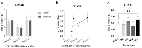 The ectodysplasin A2 receptor (EDA2R) area percentages in the cortex and medulla of normal fetal kidney tissues during developmental phases 2, 3, and 4 (a). Data are presented as the mean ± SD (vertical line) and analyzed via an ordinary one-way ANOVA test followed by Tukey’s multiple comparison test. At each developmental phase, ten representative pictures were assessed per observed region. The expression dynamics of EDA2R (b) showed by linear and nonlinear regression modeling of area percentages through developmental phases in the cortex and medulla of CTRL fetal kidney tissues. Data are presented as the mean ± SD. The EDA2R area percentages in the duplex kidneys (DK), horseshoe kidneys (HK), hypoplastic kidneys (HYP), and dysplastic kidneys (DYS) fetal tissue (c). Data are presented as the mean ± SD (vertical line) and analyzed via an ordinary one-way ANOVA test followed by Tukey’s multiple comparison test. Significant differences are indicated by ** p < 0.01. At each time point, twenty representative pictures were assessed.