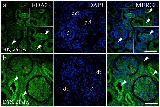 Immunofluorescence staining of human fetal kidneys with the antibodies for ectodysplasin A2 receptor (EDA2R) (a,b). The arrows indicate the pattern of expression of EDA2R in glomeruli (g), proximal convoluted tubules (pct), distal convoluted tubules (dct), and dysplastic tubules (dt), indicated on the nuclear 4′,6-diamidino-2-phenylindole staining image (DAPI). The staining patterns of EDA2R in HK, DK, and HYP mostly correspond in terms of their localization and intensity; thus, a representative image was selected from the horseshoe kidney sample at the 26th dw. Immunoexpression of EDA2R and DAPI staining and merged EDA2R and DAPI in the horseshoe kidneys (HK) at 26th dw (a) and dysplastic kidney (DYS) at 21st dw (b). The inserts that match the dashed boxes indicate the major region of protein expression. The scale bar is 50 μm for all images.