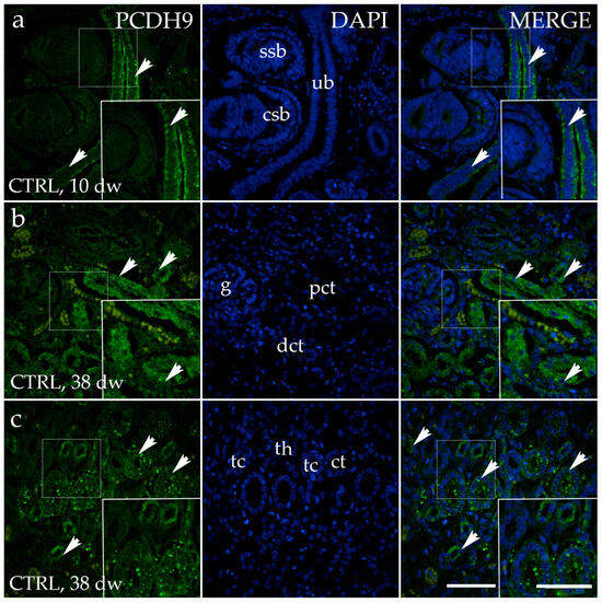 Immunofluorescence staining of the renal cortex (a,b) and medulla (c) of normal human fetal kidney at the 10th and 38th developmental weeks (dws) (CTRL) with the antibody for protocadherin 9 (PCDH9). The arrows indicate the pattern of expression of PCDH9 in the ureteric bud (ub), comma-shaped body (csb), s-shaped body (ssb), glomeruli (g), proximal convoluted tubules (pct) and distal convoluted tubules (dct) in the renal cortex, collecting tubules (ct), and thick (tc) and thin (th) segments of the loop of Henle of the renal medulla indicated on the nuclear 4′,6-diamidino-2-phenylindole staining image (DAPI). Immunoexpression of merged PCDH9 and DAPI in normal human fetal kidney (MERGE). The inserts that match the dashed boxes indicate the major region of protein expression. The scale bar is 50 μm for all images.