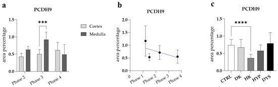 The protocadherin 9 (PCDH9) area percentages in the cortex and medulla of normal fetal kidney tissues during developmental phases 2, 3, and 4 (a). Data are presented as the mean ± SD (vertical line) and analyzed via an ordinary one-way ANOVA test followed by Tukey’s multiple comparison test. Significant differences are indicated by ***, p < 0.001. At each developmental phase, ten representative pictures were assessed per observed region. The expression dynamics of PCDH9 (b) showed by linear and nonlinear regression modelling of area percentages through developmental phases in the cortex and medulla of CTRL fetal kidney tissues. Data are presented as the mean ± SD. The PCDH9 area percentages in the duplex kidneys (DK), horseshoe kidneys (HK), hypoplastic kidneys (HYP), and dysplastic kidneys (DYS) fetal tissue (c). Data are presented as the mean ± SD (vertical line) and analyzed by an ordinary one-way ANOVA test followed by Tukey’s multiple comparison test. Significant differences are indicated by **** p < 0.0001. At each time point, twenty representative pictures were assessed.