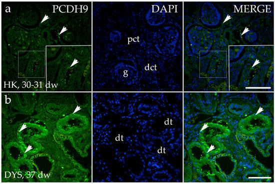 Immunofluorescence staining of human fetal kidneys with the antibodies for protocadherin 9 (PCDH9) (a,b). The arrows indicate the pattern of expression of PCDH9 in glomeruli (g), proximal convoluted tubules (pct), distal convoluted tubules (dct), and dysplastic tubules (dt), indicated on the nuclear 4′,6-diamidino-2-phenylindole staining image (DAPI). The PCDH9 staining patterns in CTRL, DK, and HYP correspond largely in their localization and intensity; therefore, a representative image was chosen from the horseshoe kidney sample of the 30–31st dw. Immunoexpression of PCDH9 and DAPI staining and merged PCDH9 and DAPI in the horseshoe kidneys (HK) at 30–31st dw, (a) and dysplastic kidney (DYS) at 37th dw (b) (Figure 5a). The inserts that match the dashed boxes indicate the major region of protein expression. The scale bar is 50 μm for all images.