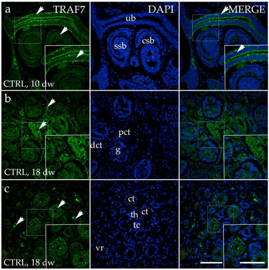 Immunofluorescence staining of the renal cortex (a,b) and medulla (c) of normal human fetal kidney at the 10th and 18th developmental weeks (dws) (CTRL) with the antibody for TNF receptor-associated factor 7 (TRAF7). The arrows indicate the pattern of expression of TRAF7 in the ureteric bud (ub), comma-shaped body (csb), s-shaped body (ssb), glomeruli (g), proximal convoluted tubules (pct) and distal convoluted tubules (dct) in the renal cortex, and vasa recta (vr), collecting tubules (ct), and thick (tc) and thin (th) segments of the loop of Henle of the renal medulla indicated on the nuclear 4′,6-diamidino-2-phenylindole staining image (DAPI). Immunoexpression of merged TRAF7 and DAPI in normal human fetal kidney (MERGE). The inserts that match the dashed boxes indicate the major region of protein expression. The scale bar is 50 μm for all images.