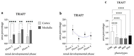The medulla of healthy fetal kidneys displayed a significantly higher area percentage of TRAF7-positive cells compared to the cortex in all observed developmental phases (p < 0.0001, Figure 9a). The expression of TRAF7 in the healthy kidneys throughout the observed developmental phases followed a quadratic trend, with the peak at Ph1 (R2 = 29%, Figure 9b).
