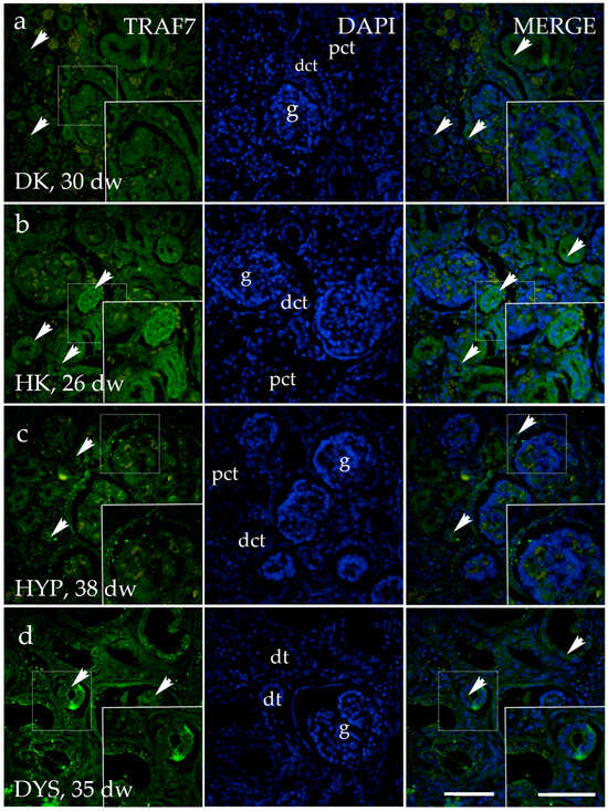 Immunofluorescence staining of human fetal kidneys with the antibodies for TNF receptor-associated factor 7 (TRAF7) (a–d). The arrows indicate the pattern of expression of TRAF7 in glomeruli (g), proximal convoluted tubules (pct), distal convoluted tubules (dct), and dysplastic tubules (dt), indicated on the nuclear 4′,6-diamidino-2-phenylindole staining image (DAPI). Immunoexpression of TRAF7 and DAPI staining and merged TRAF7 and DAPI in the duplex kidney (DK) at 30th dw (a), horseshoe kidneys (HK) at 26th dw, (b), hypoplastic kidney (HYP) at 38th dw (c), and dysplastic kidney (DYS) at 35th dw (d). The inserts that match the dashed boxes indicate the major region of protein expression. The scale bar is 50 μm for all images.