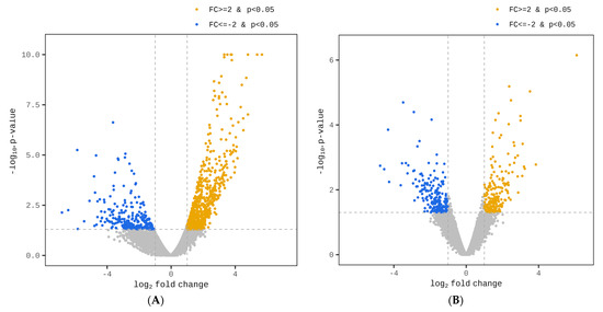 Volcano plots depicting the influence of maternal overnutrition during mid- to late gestation on the gene expression in subcutaneous adipose tissue (SAT) (A) and liver (B) of newborn Hanwoo calves. The Y-axis illustrates the negative logarithm of p-values (−log10 p-values), and the X-axis represents the fold change (FC; log2 fold change). Blue dots to the left signify downregulated, differentially expressed genes (DEGs), while orange dots to the right mark upregulated DEGs. DEGs significantly affected by maternal overnutrition (p-value < 0.05) are emphasized.