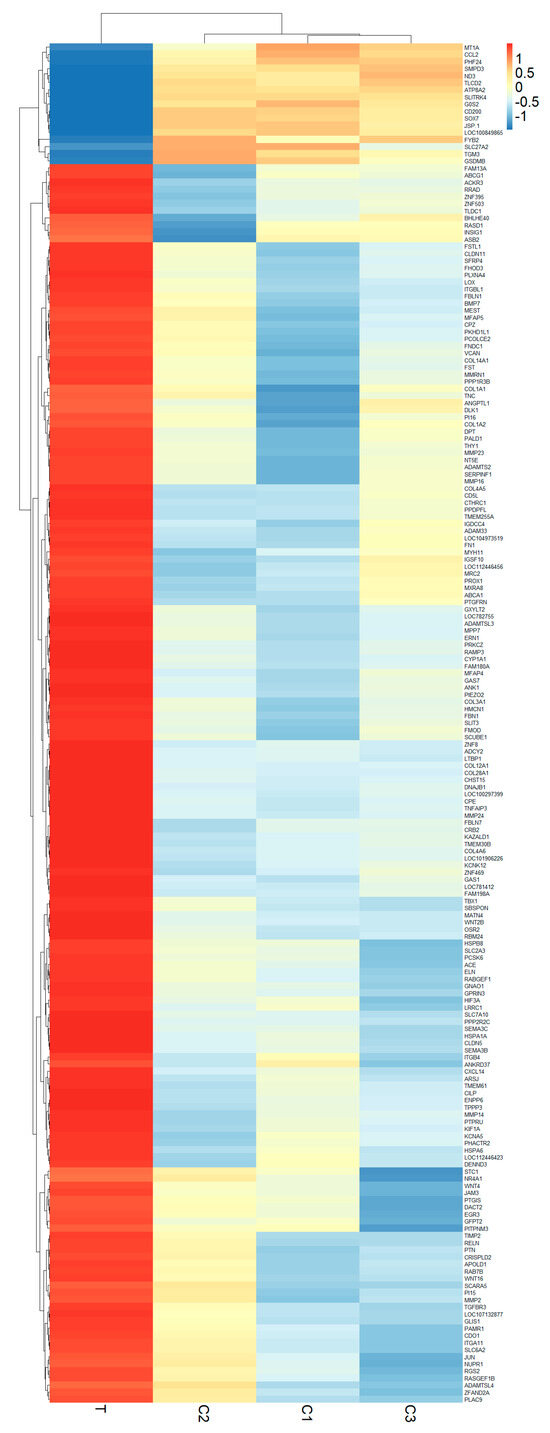 Heatmaps illustrating DEGs in the SAT of newborn Hanwoo calves. Within the heatmap, columns correspond to individual samples, where sample T was from the treatment group and samples C1, C2, and C3 were from the control group. A dendrogram is provided to display the overall expression trends visually. The spectrum of colors from red to blue signifies the extent of gene upregulation and downregulation, respectively.