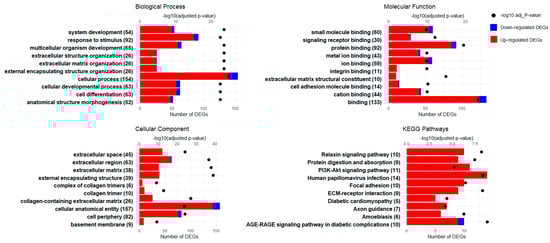 GO enrichment and KEGG pathway analysis for the SAT: This figure showcases the outcomes of both Gene Ontology (GO) enrichment and KEGG pathway analyses, focusing on the top 10 identified terms across biological processes, molecular functions, and cellular components, as well as the key KEGG pathways affected in the SAT as a result of maternal overnutrition. The biological processes depict general categories where gene expression is modified, the molecular functions show changes in protein activity or binding capabilities, and the cellular components indicate the locations within the cell where these changes occur. The KEGG pathways offer insights into the complex metabolic and signaling pathways that are affected. The Y-axis indicates the number of differentially expressed genes (DEGs), with blue and red bars representing downregulated and upregulated DEGs for each identified term, respectively, providing an indication of the directionality of the expression changes. The X-axis shows the number of DEGs associated with each of the top 10 GO terms and KEGG pathways. On the opposing Y-axis, the −log10 adjusted p-values for each term are illustrated by dots, providing a measure of significance for the enrichment of each term.