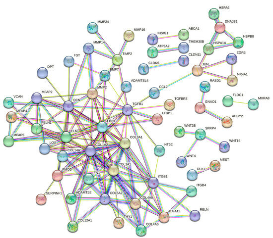 Protein–Protein Interaction (PPI) Network for the SAT: This network illustrates the interactions between proteins encoded by DEGs as a response to maternal overnutrition. Nodes symbolize the individual proteins, while the connecting lines (edges) indicate the protein interactions.