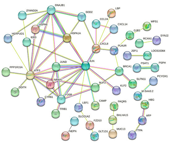 For the liver, the PPI analysis incorporated 129 significant DEGs (p < 0.01) to assemble a network of 103 proteins (nodes) connected by 61 edges, revealing a less connected yet functionally significant interaction pattern. This intricate network displays an average node degree of 2.04, meaning that each protein typically interacts with two other proteins. The network’s average local clustering coefficient is 0.341. Proteins like ATF3, FOS, and JUN, with high degrees of connectivity, are known to play significant roles beyond the general stress response, such as in endothelial vascular disease and cellular adaptation to stress, contradicting the notion of their being involved only in generic stress responses. Their high connectivity in the liver network suggests a nuanced role in liver adaptation to overnutrition, potentially influencing pathways related to inflammation and stress protection, as highlighted by proteins such as CXCL8 and the HSPs HSPA6 and HSPA1A (Figure 7). The depiction of these networks in Figure 6 and Figure 7 aims to provide a visual interpretation of the complex interactions, with an enhanced focus on readability and the inclusion of key proteins to aid in the understanding of their specific roles and interconnections.