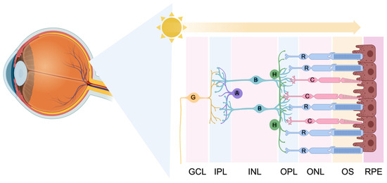 The neural retina (which excludes the retinal pigment epithelium (RPE)) is composed of three retinal nuclear layers (laminae) and two intermediary synaptic plexiform layers. Electrochemical signals are processed sequentially in these layers, prior to being transmitted to the brain. Rod and cone photoreceptors are light-sensitive retinal cells responsible for initiating most of the light response in the retina. Light passes through the eye and then the retina itself until it reaches the outer nuclear layer (ONL) of the retina where the rod and cone photoreceptors are located. In the outer segments, which extend from the cell bodies of the photoreceptors, incoming photons are absorbed by visual pigment molecules (such as Rhodopsin), and the phototransduction cascade is initiated. Graded membrane potentials are transmitted from the photoreceptors in the ONL and processed in the outer plexiform layer (OPL) through synaptic connections with cells in the inner nuclear layer (INL). The INL is composed of the cell bodies of bipolar, horizontal, amacrine, and interplexiform cells. These neurons modulate local signal processing in the retina before communicating through the inner plexiform layer (IPL) to the most proximal retinal layer, the ganglion cell layer. Retinal ganglion cells (RGCs) are the “output” neurons of the retina. RGCs receive signals from bipolar and amacrine cells, integrate and encode the visual information from surrounding receptive fields, and generate action potentials that are propagated through converging RGC axons to the optic nerve (Figure 1). Encoded visual signals leave the optic nerve to eventually be conveyed to, and interpreted by, the visual cortex [2].