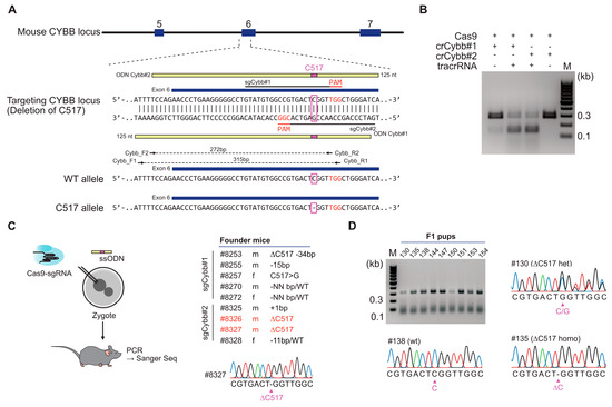 For production of the mutant CYBB allele, zygotes isolated from C57BL/6 mice were electroporated with Cas9 protein, one of the validated guide RNAs (sgCybb#1 or sgCybb#2), and a modified single-stranded DNA oligonucleotide (ODN-Cybb#1 with sgCybb#1 or ODN-Cybb#2 with sgCybb#2) (Figure 1C). The DNA oligonucleotide had homology sequences flanking the targeted codon but lacked nucleotide C517 (Figure 1A,C). The induction of a double-strand break (DSB) near C517 allowed editing by homologous recombination using ODN-Cybb as a donor template, leading to the introduction of the single-nucleotide deletion into the coding region of CYBB. From the electroporation of C57BL/6 mouse zygotes, we obtained nine pups, which were genotyped by PCR amplification using the primer pair Cybb_F1/Cybb_R1 and sequencing of the CYBB exon 6 region. Among these offspring, we identified seven founder mutants carrying random indels, while two mice exhibited only the desired deletion of C517 (Figure 1C, #8326 and #8327).