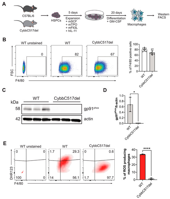 To validate the expected phenotype of the CybbC517del mouse line, we investigated gp91phox expression in in vitro-derived macrophages obtained from Sca1+ bone-marrow cells isolated from CybbC517del mutant mice (Figure 2A). In the wild-type control littermates, a specific gp91phox band at approximately 58 kDa was observed, while this band was absent in the mutant sample Figure 2C,D). The absence of the signal in the mutant sample indicates that the C517 deletion leads to impaired expression of gp91phox.