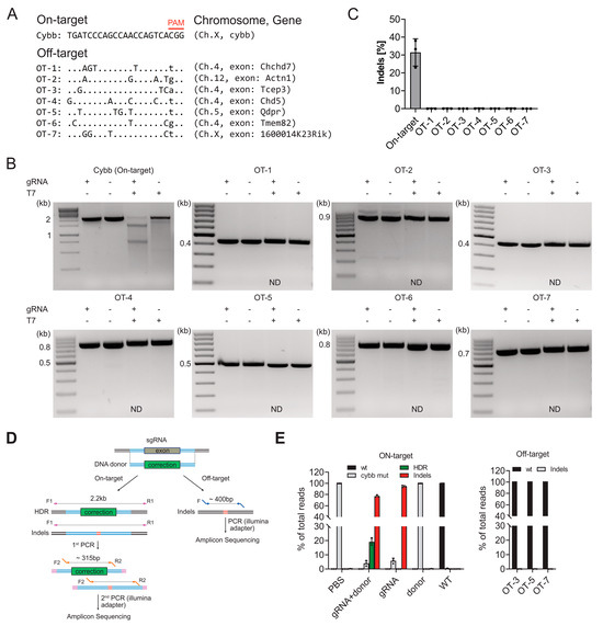 Off-target sites for sgRNA-Cybb were selected using CRISPOR (http://crispor.tefor.net/ (accessed on 14 May 2021)). Wizard Genomic DNA Purification Kit (Promega, Walldorf, Germany) following the manufacturer’s instructions. For the on-target site, PCR was done using PrimeStar GXL (Takara, Mountain View, CA, USA) with Cybb-geno-for and Cybb-geno-rev primers (Table 1) using the following conditions: 98 °C for 2 min, 30 cycles (98 °C for 10 s, 55.1 °C for 10 s, 68 °C for 50 s), and 68 °C for 10 min. For the off-target sites, PCR was done using Q5® High-Fidelity DNA Polymerase (NEB) with site-specific primers (Table 1) using the following conditions: 98 °C for 30 s, 35 cycles (98 °C for 10 s, 56.2 °C (for Actn1 site)/62 °C (for Chd5, Tmem82 and K23Rik sites)/60 °C (for Chchd7, Tceb3 and Qdpr sites) for 30 s, 72 °C for 30 s), and 72 °C for 2 min. PCR amplicons were purified using GeneJET PCR Purification Kit (ThermoFischer Scientific).