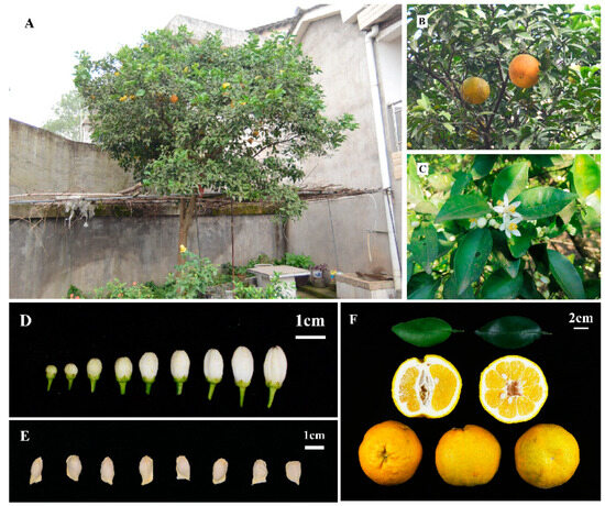 Morphological features of ‘Local Juhong’. (A) Tree. (B) Fruits on the tree. (C) Flowers. (D) Flowers at different development stages. (E) Seeds. (F) Leaves and fruits.