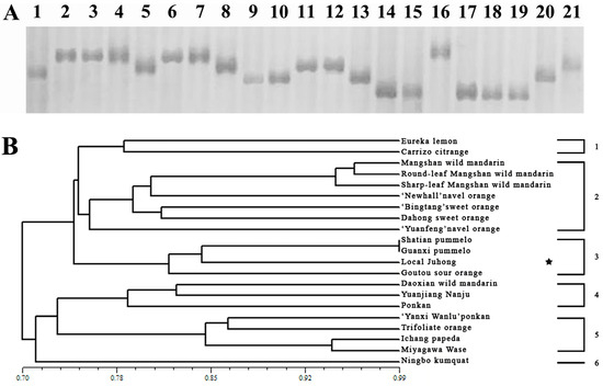Phylogenetic analysis based on nuclear SSR marker. (A) Silver-stained polyacrylamide gel showing polymorphism among 21 tested citrus genotypes and related genera by using the nSSR primer Ma6_64. Materials 1–21 are listed in Table 1. (B) UPGMA dendrogram analysis of the 21 citrus genotypes and related genera based on 16 nSSR markers. The asterisk refers to the ‘Local Juhong’ sample.