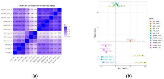 A total of 44,432 genes were identified through sequence alignment, including 8587 novel genes. FPKM values were utilized as the normalized expression values of genes, revealing that the expression levels of most genes fell within the range of 0.1 to 10. A Pearson correlation analysis demonstrated that the correlation coefficients for the three replicates of G29_CK, PBC688_CK, G29_14dci, and PBC688_14dci were greater than 0.91, 0.95, 0.794, and 0.892, respectively (Figure 2a). Alternatively, a principal component analysis of all genes revealed that the first two principal components accounted for 57.47% and 19.63% of the variance, respectively. Notably, significant separation among different treatments was observed. Specifically, the three biological replicates of G29_CK, PBC688_CK, and PBC688_14dci clustered together, while the three biological replicates of G29_14dci were more dispersed (Figure 2b).