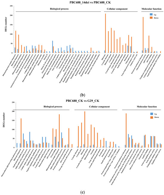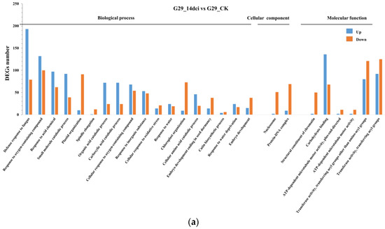 The DEGs between G29_14dci and G29_CK, PBC688_14dci and PBC688_CK, PBC688_CK and G29_CK, and PBC688_14dci and G29_14dci were linked to 26, 49, 44, and 19 biological processes, cellular components, and molecular functions, respectively (Figure 4).