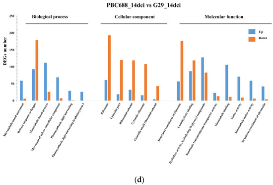 Gene ontology (GO) terms associated with differentially expressed genes between different treatments. (a) GO annotation and enrichment analysis of DEGs between G29_14dci and G29_CK; (b) GO annotation and enrichment analysis of DEGs between PBC688_14dci and PBC688_CK; (c) GO annotation and enrichment analysis of DEGs between PBC688_CK and G29_CK; (d) GO annotation and enrichment analysis of DEGs between PBC688_14dci and G29_14dci.