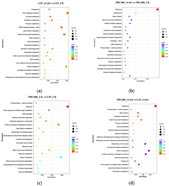 The top 20 Kyoto Encyclopedia of Genes and Genomes (KEGG) pathways with the highest representation of differentially expressed genes (DEGs) between different treatments. (a) The top 20 KEGG pathways of DEGs between G29_14dci and G29_CK; (b) the top 20 KEGG pathways of DEGs between PBC688_14dci and PBC688_CK; (c) the top 20 KEGG pathways of DEGs between PBC688_CK and G29_CK; (d) the top 20 KEGG pathways of DEGs between PBC688_14dci and G29_14dci.