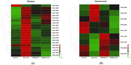 In the DEGs associated with plant–pathogen interactions and the MAPK signaling pathway, approximately 30 DEGs involved in hormone signal transduction were identified, including 21 DEGs involved in the ethylene pathway and 9 DEGs involved in the ABA pathway (Figure 7). Among these, 20 DEGs encoding ethylene were significantly upregulated following CMV infection in G29, while only 2 of the 21 DEGs were significantly upregulated following CMV infection in PBC688 (Figure 7a). Additionally, three DEGs (T459_05520, T459_00152, and T459_09556) involved in the ABA pathway were upregulated following CMV infection in G29 (Figure 7b). This differential expression pattern suggested a potential role for the ethylene pathways in the response to CMV infection, particularly in the G29 genotype.