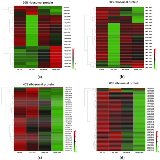 Heatmaps of the differentially expressed genes (DEGs) associated with ribosome pathway. (a) Heatmaps of the DEGs associated with 30S ribosomal proteins; (b) heatmaps of the DEGs associated with 50S ribosomal proteins; (c) heatmaps of the DEGs associated with 40S ribosomal proteins; (d) heatmaps of the DEGs associated with 60S ribosomal proteins.