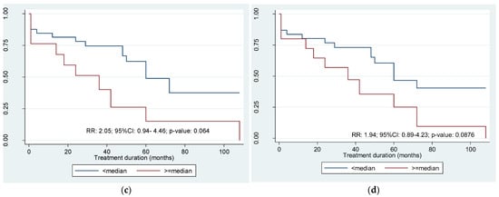 The ratio of the combination of TNFα+IL6+TGFβ1/IL10+IFNγ gene polymorphism was computed, and a possible association with the probability of relapse-free survival was explored. Kaplan–Meier (Mantel–Haenszel model) estimates of the probability of relapse-free survival, for a gene expression ratio above the overall median, were relatively high (RR: 3.01; 95% CI: 1.1–8.3; p-value = 0.0261) (Figure 1a). The ratio of the results of IL6/IL10+TGFβ1 was computed. Similarly, subjects with a gene expression ratio above the overall median were 2.4 times more at risk for relapse during the period of TKI treatment (RR: 2.4; 95% CI: 1.1–5.2; p-value = 0.022) (Figure 1b). The effect of individual cytokine SNPs (ratio of IL6/IL10) was not statistically significant (RR: 0.445; 95% CI: 0.180–1.1; p-value = 0.072) nor was the ratio of IL6/TGFβ1 (RR: 0.013). Though patients with a higher than median gene expression (ratio of TNFα/IL10) had twice the risk for relapse, it was not statistically significant (RR: 1.92; 95% CI: 0.877–4.20; p-value: = 0.097). Regarding the ratio of IL6+TNFα/IL10, the relative risk of relapse is twice as high among patients with a higher than median gene expression profile (RR: 2.05; 95% CI: 0.94–4.46; p-value = 0.064), albeit not significant (Figure 1c). The ratio of IFNγ+TNFα/IL10, in patients with a gene expression profile above the median ratio, had twice the risk of relapse during the treatment period of 10 years or less (RR: 1.94; 95% CI: 0.89–4.23; p-value = 0.0876) (Figure 1d).