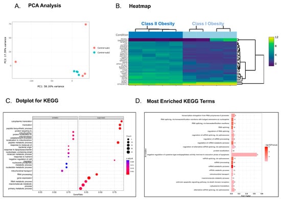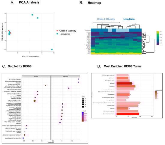 Evaluation of the platelet transcriptome in individuals with Class II obesity compared to patients with lipedema. Principal component analysis (PCA) shows the separation between Class II obesity and lipedema along PC1 and PC2 (p < 0.01). Bray–Curtis dissimilarity matrix was used to compute the inter-sample similarities. Statistical significance was estimated using PERMANOVA (A) and heatmap (B) of the top 30 differentially expressed genes in platelets from patients with Class II obesity (BMI 38 mg/kg2) compared with patients with lipedema (BMI 38 mg/kg2). KEGG dotplot (C) and GO (D) pathway enrichment analyses are listed, and the most enriched pathways are illustrated.