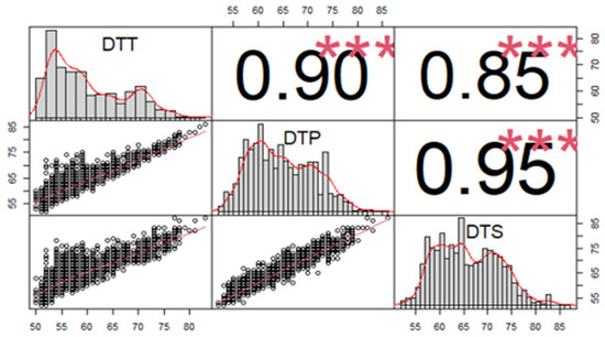 Correlation analysis was conducted based on the BLUP values of flowering time-related traits (Figure 1). The results showed that there was a highly significant positive correlation between each of the two traits. The correlation coefficient between DTP and DTS was the highest, with an r-value of 0.95, while the correlation coefficient between DTT and DTS was the lowest, with an r-value of 0.88.