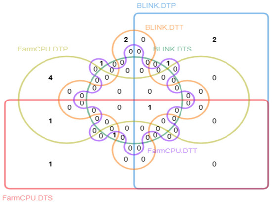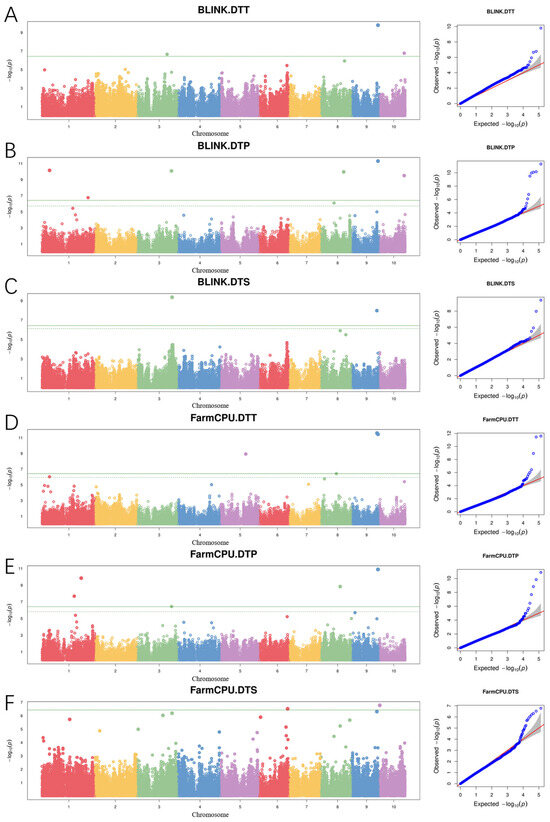 To accurately identify the significant loci associated with maize flowering time, BLINK, and FarmCPU, two multi-locus models were employed for the GWAS of flowering time-related traits. With the threshold at −log10p > 6.4, the BLINK model detected nine SNPs, including three for DTT, four for DTP, and two for DTS. The FarmCPU model detected thirteen SNPs, including three for DTT, six for DTP, and four for DTS (Table 3, Figure 2).