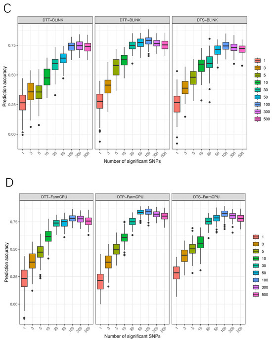 As the number of SNPs with the lowest p-value increased from 1 to 1000, the prediction accuracy first increased and then decreased (Figure 4C,D, Supplementary Table S4). When the number of significant SNPs increased to 100, the highest prediction accuracy was achieved. For the Blink model, the highest prediction accuracies for DTT, DTP, and DTS were 0.73, 0.79, and 0.74, respectively. For the FarmCPU model, the highest prediction accuracies for DTT, DTP, and DTS were 0.78, 0.84, and 0.82, respectively. The FarmCPU model attains higher prediction accuracy than the Blink model. Compared to GS with all the markers, the prediction accuracy using 100 significant markers can be greatly improved.