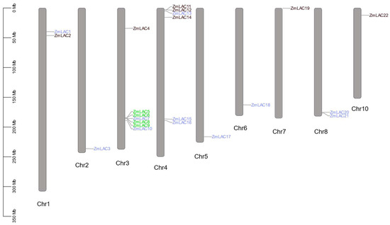 Genes belonging to the LAC family are spread out over various maize chromosomes. Note: green genes are tandem duplications, blue genes are segmental duplications.