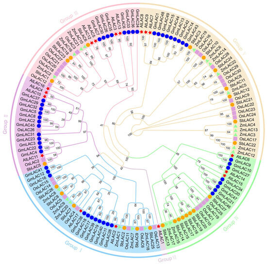 We elucidated the evolutionary relationship between maize LAC and other plant LACs; a dataset comprising 17 LAC proteins from Arabidopsis [17], 30 from rice [23], 27 from sorghum [24], and 49 from soybean was assembled from studies on these respective LAC gene families [12]. The LAC protein sequences from maize, Arabidopsis, rice, sorghum, and soybean were aligned using the default parameters of MEGA software (version 10). A tree was generated to assess the robustness of the findings by employing the neighbor-joining technique and conducting 1000 bootstrap resampling iterations. Evolview software was employed for the visualization and enhancement of the phylogenetic trees (https://www.evolgenius.info/evolview; accessed on 30 January 2024) [68].