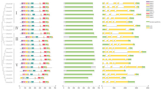 The maize LAC gene family’s structure was clustered and analyzed using TBtools software. Figure 4 shows that the maize LAC gene family is divided into four subfamilies: groups I, III, IV, and V (Figure 4). These findings are in line with the LAC genes in Arabidopsis, sorghum, soybean, and rice, with groups II and VI lacking any members from the maize LAC gene family. According to the maize LAC gene family structure map, all gene members contained introns, exons, and UTR structures. They had 2–5 introns and 3–6 exons. Similar to the laccases in other plants, it was inferred that these laccases may be more conserved in different plants.