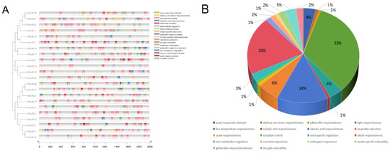 Investigating the cis-regulation factors that affect the promoters of maize LAC family genes. (A) Different cis-regulatory elements are spread out. (B) The cis-acting elements that make up the promoters of maize LAC genes vary in their relative proportions.