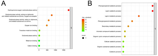 The promoter sequence of maize LAC genes contained 18 distinct cis-acting elements that were identified (Figure 5). A significant proportion (33.1%) of them are related to the plant’s light response, followed by those related to methyl jasmonate responsiveness (20%). Furthermore, specific cis-regulatory components have been identified to be involved in the reaction to various hormones (like gibberellin, abscisic acid, auxin, and salicylic acid), stress factors (such as anaerobic conditions, low temperature, and drought), defense responses, the control of seed-specific genes, the growth of meristems, and the expression of endosperm genes. Various cis-acting elements were found in various promoter regions of LAC genes, indicating the diverse functions of LAC genes in maize’s growth and development. The maize LAC genes were functionally annotated using Weishengxin for visualization and analysis, with data from the ShinyGO v0.741: GO Enrichment Analysis. Of the 22 maize LAC genes examined, 11 were successfully annotated (Figure 6). The molecular function enrichment analysis revealed prominent associations with phenylpropanoid decomposition and lignin catabolism (Figure 6A). Additionally, their biological function enrichment highlighted a notable enrichment in oxidoreductase activity and copper ion binding (Figure 6B).