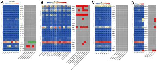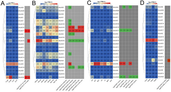 The examination of the transcriptome sequencing data of maize subjected to different environmental stresses, including salt stress (PRJNA414300) [80], waterlogging stress (PRJNA606824) [81], high- and low-temperature stress (PRJNA645274) [82], and drought stress (PRJNA576545) [83], was carried out using maize B73_V5 genomic information. From different abiotic stress responses, a heat map of the maize LAC gene family was generated (Figure 9). Overall, the expression of the maize LAC gene family was high under waterlogging stress but lower under drought stress. ZmLAC5, ZmLAC10, and ZmLAC17 showed elevated levels of expression when exposed to different abiotic stress factors (Figure 9A). The expression of three LAC genes (ZmLAC10, ZmLAC17, and ZmLAC22) was notably elevated under salt stress in both salt-sensitive and salt-tolerant maize varieties in comparison to their controls. Three LAC genes (ZmLAC5, ZmLAC15, and ZmLAC17) were significantly upregulated under waterlogging stress, while seven LAC genes (ZmLAC2, ZmLAC3, ZmLAC7, ZmLAC9, ZmLAC10, ZmLAC18, and ZmLAC19) were significantly downregulated (Figure 9B). Four LAC genes (ZmLAC5, ZmLAC9, ZmLAC17, and ZmLAC22) showed comparable expression profiles in response to both high- and low-temperature stress, with ZmLAC5 being notably upregulated, while ZmLAC9, ZmLAC17, and ZmLAC22 were significantly downregulated (Figure 9C). Under drought stress, only ZmLAC4 was significantly upregulated (Figure 9D), while other genes remained unchanged.