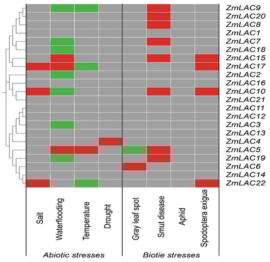 The maize LAC gene family’s expression pattern in reaction to abiotic and biotic pressures is displayed as a heat map. A gray hue signifies no alteration in expression, a crimson hue signifies an escalation in expression, a verdant hue signifies a reduction in expression, and a cerulean hue signifies both an increase and decrease in expression.