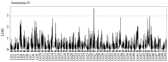 QTL mapping and significant regions were identified for the concentration of ammonia-N. The red dashed line represents the delimited LOD threshold equal to 3.