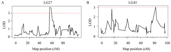 LOD curve of QTLs affecting the blood concentration of ammonia-N. The X-axis represents the marker distance, the Y-axis represents the LOD value, and the dashed line represents the delimited LOD threshold equal to 3. (A) Ammonia-N LOD curve on LG27. (B) Ammonia-N LOD curve on LG45.
