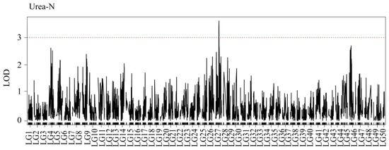 QTL mapping and significant regions were identified for the concentration of urea-N. The red dashed line represents the delimited LOD threshold equal to 3.