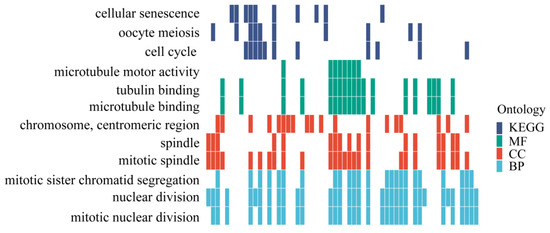 To further investigate the candidate genes associated with alkali-tolerant traits, we screened the genomic information and identified 586 potential alkali tolerance genes with SNP markers. These genes were found to be homologous to genes in humans; ggplot2 (version 3.5.0) was used for enrichment analysis. GO functional annotation revealed that these genes were involved in tubulin binding, mitotic spindle, nuclear division, and other processes. KEGG enrichment indicated that these genes may be involved in the cell cycle, cellular senescence, and oocyte meiosis signaling pathways (Figure 8).