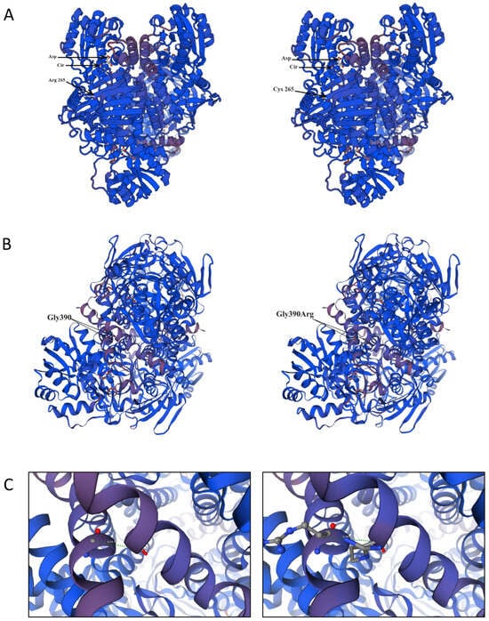 SWISS-MODEL structure of the ASS1 protein: (A) wild-type structure of ASS1 in complex with aspartic acid and citrulline (left panel) and mutant type Arg265Cys in complex with aspartic acid and citrulline (right panel), aspartic acid and citrulline are shown in sticks, Asp—aspartic acid, Cir—citrulline; (B) wild-type structure of ASS1 (left panel) and mutant-type Gly390Arg (right panel), aspartic acid and citrulline are shown in sticks; (C) close-up view of the distance (green dotted line) between two adjacent subunits in wild-type ASS1 (Gly390–Gly390)—4.14 Å (left panel), and in the mutant type (Arg390–Arg390)—5.80 Å, respectively (right panel).