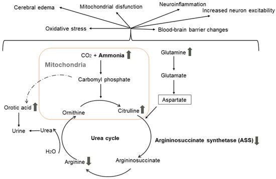 Another field that is underrepresented in dementia research is the study of high levels of ammonia as a potent neurotoxin [21], although increased blood ammonia levels have previously been established in patients with Alzheimer’s disease [22]. Ammonia is produced by the intermediary metabolism of amino acids or other nitrogen-containing compounds. It is considered that human adults produce about 1000 mmol of ammonia daily. Increased serum ammonia levels can cross the blood–brain barrier causing altered mental status or encephalopathy. Hyperammonemia is related with the reduced cerebral metabolic rate of glucose; disturbance of glutamatergic or GABAergic neurotransmission; and mitochondrial dysfunction; and dysregulated inflammation [23,24]. One of the hyperammonemia-causing factors is represented by urea cycle disorders, which are a group of inborn errors of ammonia detoxification/arginine synthesis [25]. They are due to recessive mutations in the genes for the catalytic enzymes carbamoylphosphate synthetase I (CPS1), ornithine transcarbamylase (OTC), argininosuccinic acid synthetase (ASS1), argininosuccinic acid lyase (ASL) and arginase (ARG1); one cofactor-producing enzyme, N-acetyl glutamate synthetase (NAGS); or two amino acid transporters, ornithine translocase (ORNT1) and citrin SLC25A13 (aspartate/glutamate carrier; solute carrier family 25, member 13) [26]. Complete deficiency of these enzymes causes severe hyperammonemia in the neonatal period, whereas partial enzyme deficiencies may be associated with higher ammonia levels later in life [26]. The elevations of citrulline in argininosuccinate synthetase deficiency (citrullinemia type I), argininosuccinate in argininosuccinate lyase deficiency and arginine in arginase 1 deficiency are used as screening parameters and are included in newborn screening programs for the detection of these disorders [27]. Regarding the treatment of urea cycle disorders, there are different therapeutic approaches which aim to prevent the accumulation of ammonia, reduce the production of excessive nitrogen, redirect waste nitrogen to alternative metabolic pathways and replace arginine. Depending on the onset and severity, urea cycle disorders are treated by liver transplantation, hemodialysis, arginine, sodium benzoate, sodium phenylbutyrate and sodium phenylacetate, diet, etc. These therapies contribute to increased life expectancy and can improve the neurological consequences [28,29].