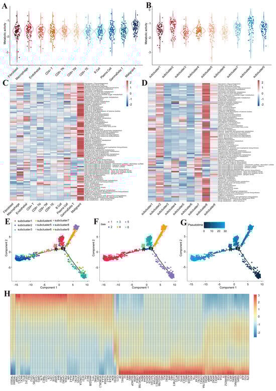 Metabolic reprogramming of malignant cells in human liver cancer. (A,B) Heat maps illustrating metabolic pathway enrichment for major cell types and malignant cell subclusters. (C,D) Quantitative violin plots demonstrating metabolic activity for major cell types and malignant cell subclusters. (E–G) Pseudotime trajectory differentiation plots for malignant cell subclusters (1, 2, 3 means branch point). (H) Heat map of differentially expressed genes along a pseudotime trajectory.