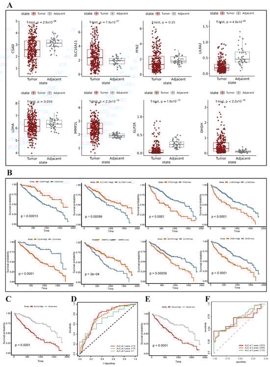 By integrating tumor cell marker genes, marker genes of metabolic pathways enriched in malignant cells, and differentially expressed genes, prognostic risk model candidate genes were established (Table S1). Subsequently, the TCGA-LIHC training cohort underwent single-factor Cox regression analysis, and the LASSO algorithm was used to screen out eight characteristic genes (CSAD, SLC16A11, PFN2, LILRA2, LDHA, IMMP2L, GLP2R, and DHDH) with the lowest cross-validation error. Among these, six genes were significantly differentially expressed between liver cancer tissue and adjacent normal tissue (CSAD, SLC16A11, LILRA2, IMMP2L, GLP2R, and DHDH) (Figure 7A). Survival analysis revealed a significant correlation between prognosis and the expression of these eight genes (Figure 7B). Specifically, elevated expression levels of SLC16A11, PFN2, LILRA2, IMMP2L, and GLP2R were linked to an unfavorable prognosis, while higher expression levels of CSAD, LDHA, and DHDH are associated with a more favorable prognosis. We used these eight genes to construct a prognostic risk model (risk score = 4.165386 × 10−2 × LDHA + 1.029364 × 10−2 × DHDH − 7.596543 × 10−3 × CSAD − 7.964147 × 10−3 × SLC16A11 + 1.141681 × 10−2 × PFN2 − 1.178891 × 10−2 × IMMP2L + 6.160969 × 10−5 × LILRA2 + 6.412018 × 10−2 × GLP2R). All the samples were divided into high-risk and low-risk groups based on a median risk score of 0.22. The survival curve showed that compared with samples in the low-risk group, the high-risk group had significantly lower overall survival (OS) (p < 0.0001) (Figure 7C,E). In order to further evaluate the effectiveness of the risk model, the ROC curve of OS was calculated. The AUC values of 1 year, 3 years and 5 years in the internal test set were all greater than 0.7, and the AUC values of 1 year, 3 years and 5 years in the external test set were also approximately 0.7, indicating high accuracy of the risk model (Figure 7D,F).