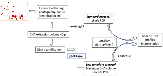 The method we use consists of a “standard protocol” that is used when sufficient DNA is present to obtain genetic profiles from a single PCR reaction, and a so-called “low-template scenario” protocol when the amount of template DNA is low. In this case, a double amplification of the sample is performed and the results of the analysis are therefore derived from the comparison of the two replicates [13]. If the quantification result is below a certain limit, the PCR is not carried out and the outcome of the assessment is that the sample does not contain sufficient human DNA. In the initial validation process, we identified quantitative limits for applying the standard and low-template scenario protocols. A visual representation of this protocol is represented in Figure 1.