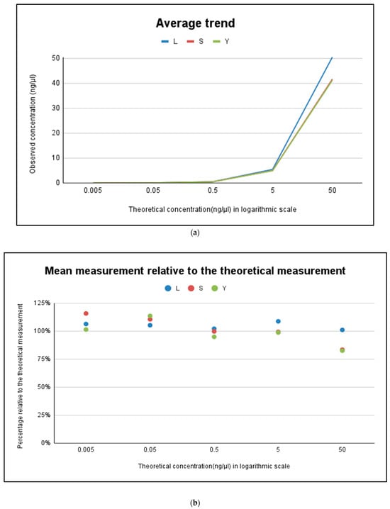 Table 2 and Figure 3a show the results obtained from the analysis of the five replicates of each standard. The average values of the five measurements were calculated, along with their standard deviations and the differences from the theoretical dosage of each standard. For the higher concentration points of the curve (50 ng/µL), the large probe returns values that are slightly different from the expected value (+1.008%), while the small and Y probes underestimate the value significantly (about −16% and −17%). When dosing highly concentrated samples, it is therefore this probe that provides the most reliable results. From the next point (5 ng/µL) onwards, the large probe proves to be less efficient than the others, overestimating the actual sample (+8.6%). The best match observed among the three probes is for the value of 0.5 ng/µL, where the absolute difference is minimal (Figure 3b). For the lower points, 0.05 and 0.005 ng/µL, all the probes slightly overestimate the expected theoretical values. Figure 3b shows the average measurement relative to the expected theoretical values in comparison to the theoretical linearity values declared by the manufacturer. The IPC probe values remained practically constant across all standard dilutions, within a Ct range of 27.6 to 27.8. We did not observe any increase in Ct values, so the value of 27.7 (average) can be considered the threshold cycle at which a sample shows no inhibition due to excessive DNA concentration or the presence of inhibitors, for the experiments conducted in our laboratory.