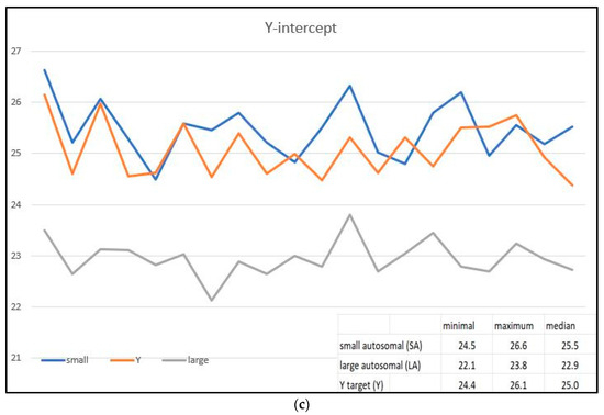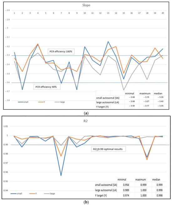Figure 4a–c show the results for the slope, Y-intercept, and R2. For the calculation of the linear regression, the five points of the standards have always been used. The examination of the experimental parameters highlighted the following. A slope close to −3.3 indicates optimal, 100% PCR amplification efficiency. In the revalidation of the system, the examination of twenty different experiments regarding the standard curves showed an average slope value of −3.3 for the small and Y probes, and −3.4 for the large probe. The maximum values observed in individual experiments were −3.68 for both small and large probes, while the minimum was −3.15 for a single experiment for the small probe. The Y-intercept value indicates the expected Ct value for a sample with Qty = 1 (for example, 1 ng/µL). Each laboratory should experimentally evaluate the Y-intercept values over time. In addition to variations that can be caused by pipetting of standards or minor lot-to-lot variations in the kits, the Y-intercept can also be affected by instrument-to-instrument variation. As expected, the Y-intercept for the Large Autosomal target is typically lower (mean value 23.0) than the Y-intercept for the Small Autosomal target (25.5) or the Y target (25.1). This is because of the higher copy number of the Large Autosomal target relative to the copy number of the Small Autosomal and Y targets (17). An R2 value ≥ 0.99 indicates a close fit between the standard curve regression line and the individual Ct data points of the quantification standard reaction. In the twenty different experiments, the mean values for the three probes were always >0.99% (SA = 0.994, LA = 0.997, Y = 0.996) (Figure 4). As shown in Figure 4b, in two experiments, we observed an R2 < 0.98, which was actually due to different outcomes of the preparation of their respective standard pairs. From our experience, this parameter can indeed indicate a significant difference in the quantification results of the samples used for standard preparation.