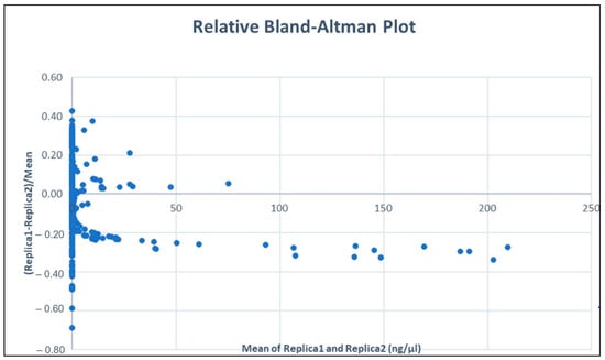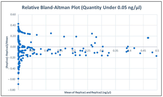 We plotted the standard measurements on the x-axis and the relative difference on the y-axis. We calculated the mean of the relative differences, which was found to be slightly below 0 for all measures but heavily dependent on the very high values. In this paper, we were interested in analysing what happens with low concentration values. Therefore, we repeated the Bland–Altman plot for values below the threshold of 0.05 ng/µL. In this second approach, we found a non-significant difference between the two results (Sample 1 and Sample 2). To be more accurate, we also performed a normality test to verify the normality of the distribution of the relative differences (the y–axis values). As we can see in Figure 5, the measures of Sample 1 for concentrations above 50 ng/µL are lower than those of Sample 2. In fact, if we consider all the concentrations, we find that Sample 1 measures about 20% less compared to Sample 2. However, as shown in Figure 6, if we restrict ourselves to lower concentrations, we find that the two measurements are not significantly different.
